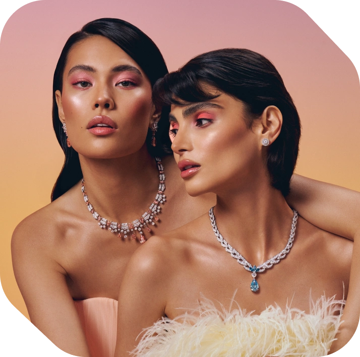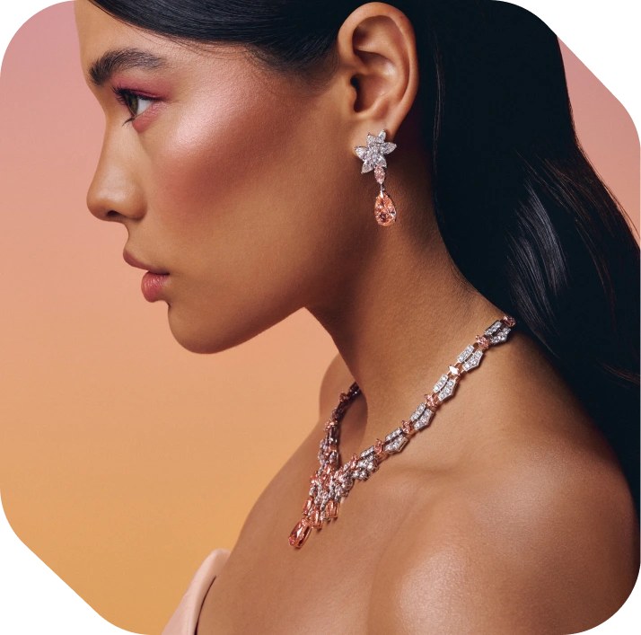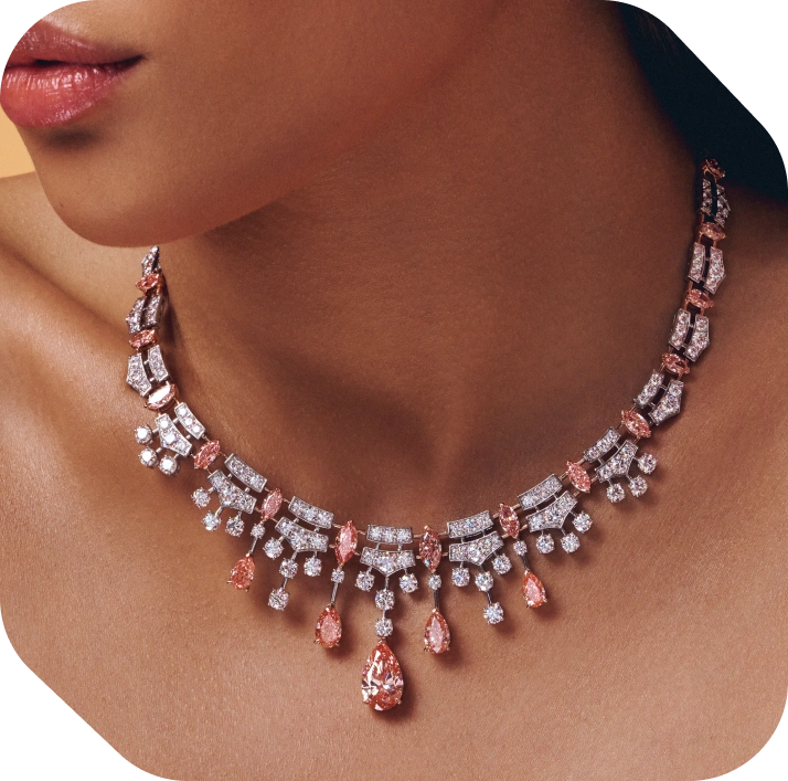 Part of the Reine en Rose collection, this 18K rose and white gold creation is defined by a 5.01 carat pear-shaped pink diamond. Framed by a precise arrangement of diamonds, the piece reaches a total of 33.77 carats and emphasizes