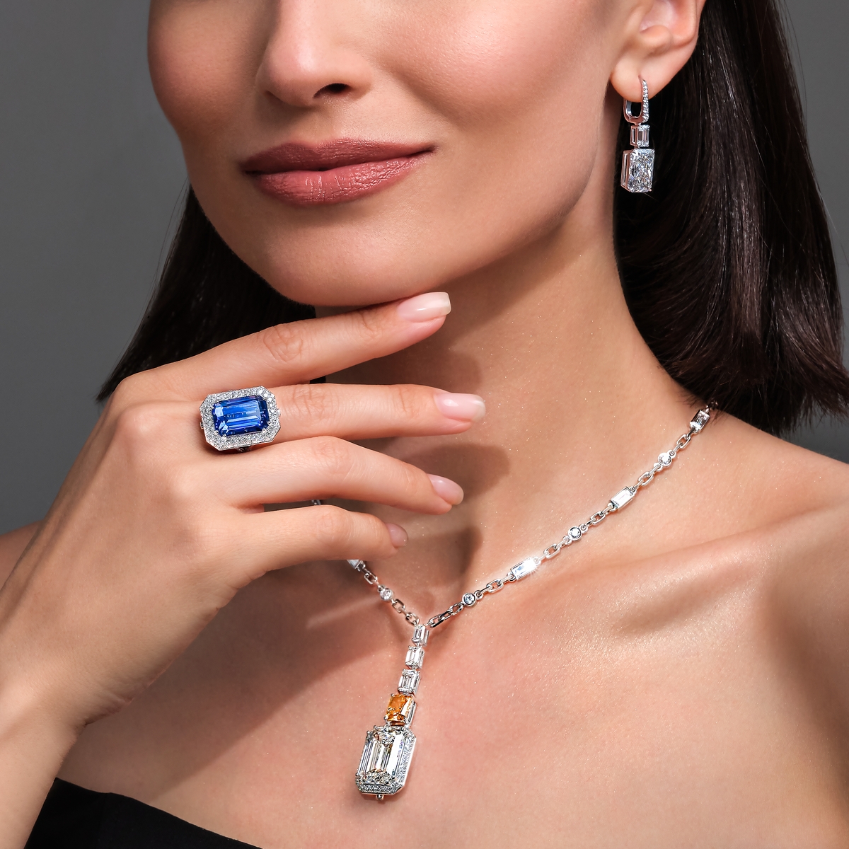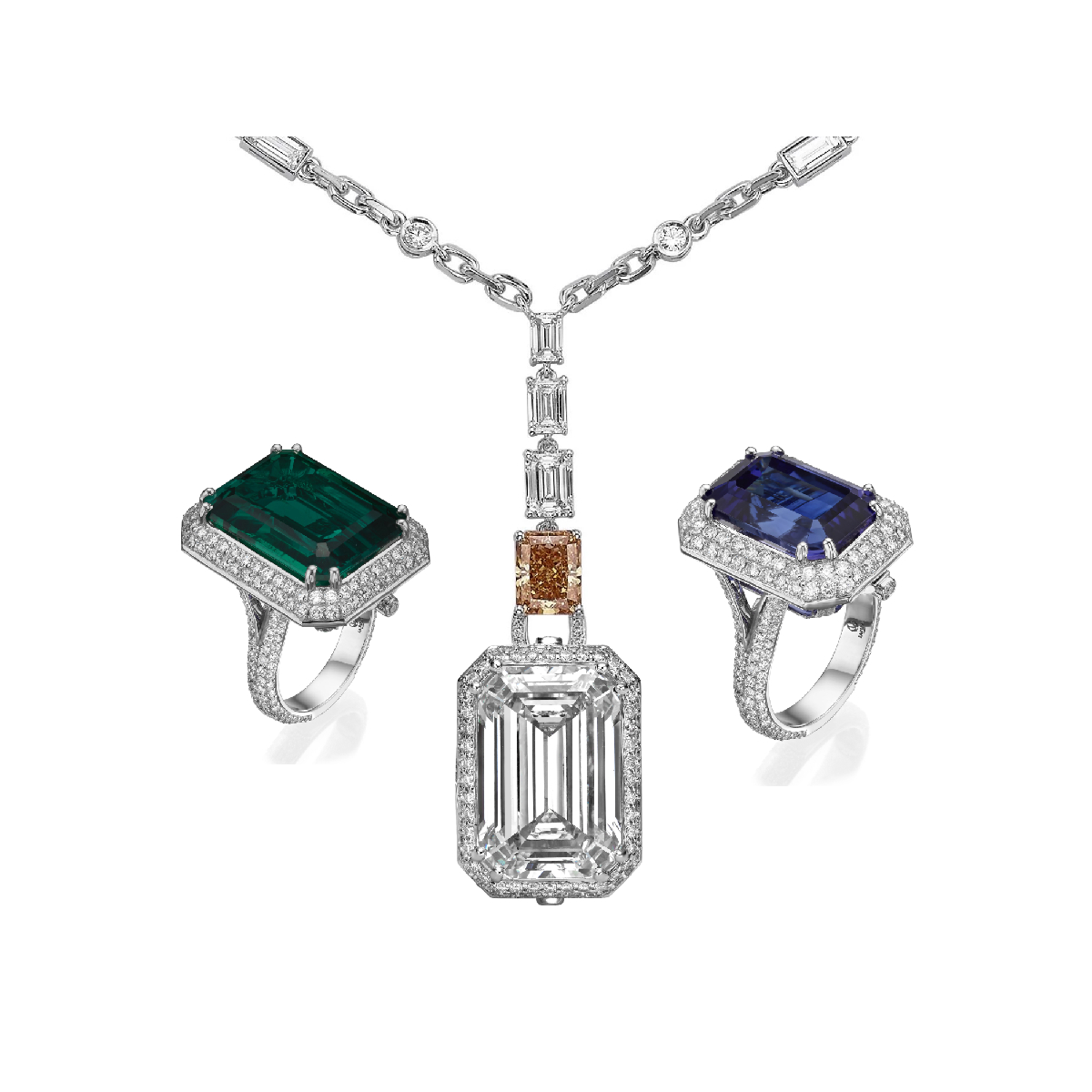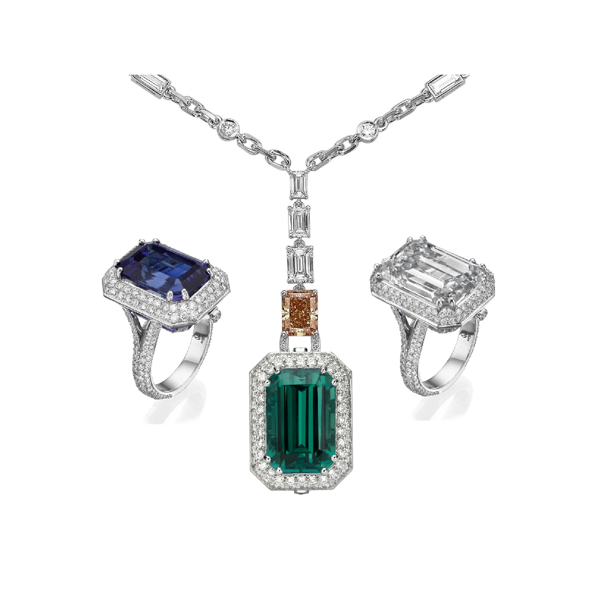and expression. This exceptional piece features 3 interchangeable center stones: Emerald, Diamond, and Tanzanite. Each stone is