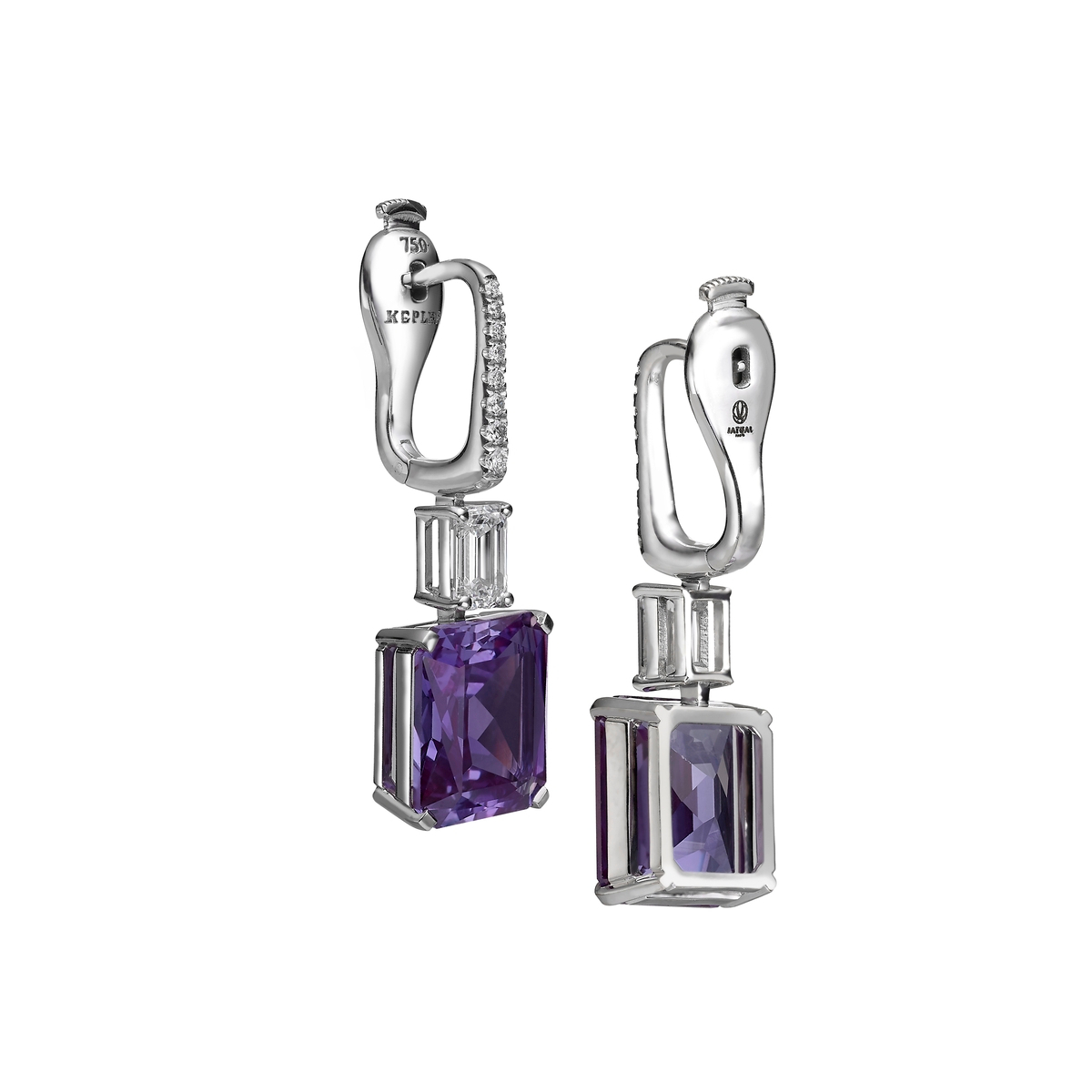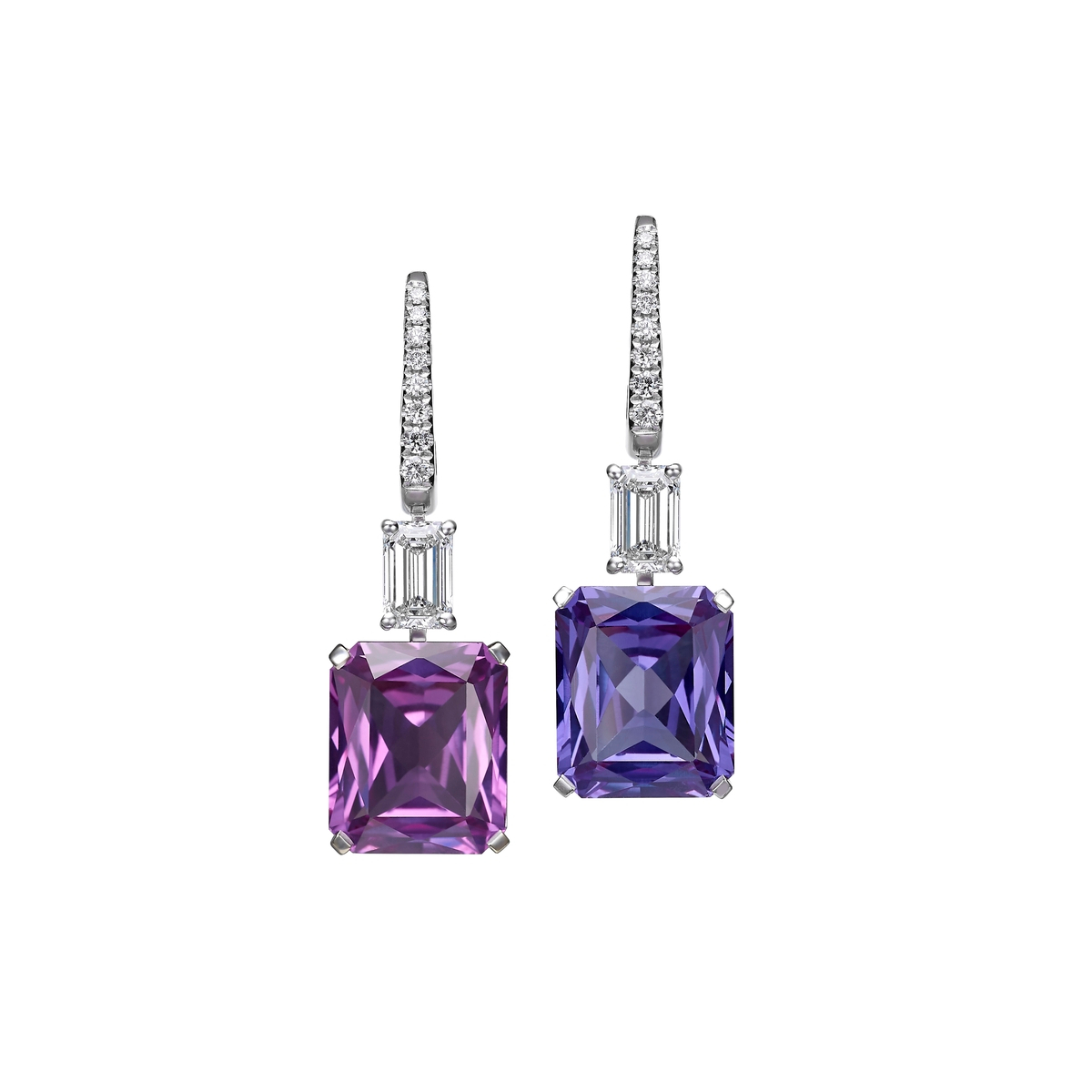 Part of the Ciel de Paris collection, the Caméléons Saphire design is crafted in 18K white gold and features two color-change radiant-cut lab-grown sapphires. A line of round and emerald-cut lab-grown diamonds completes the composition, bringing the total weight to 15.12 carats.