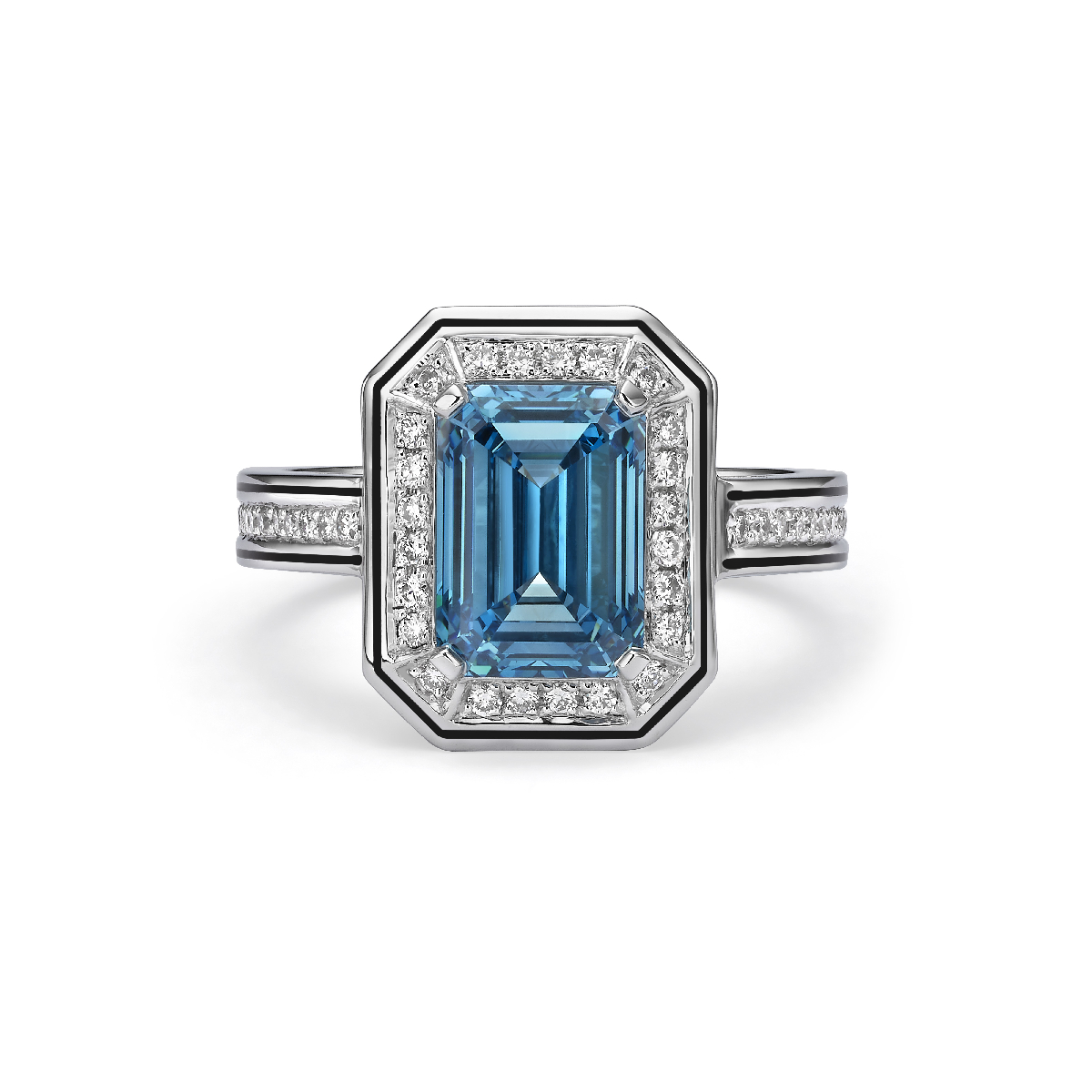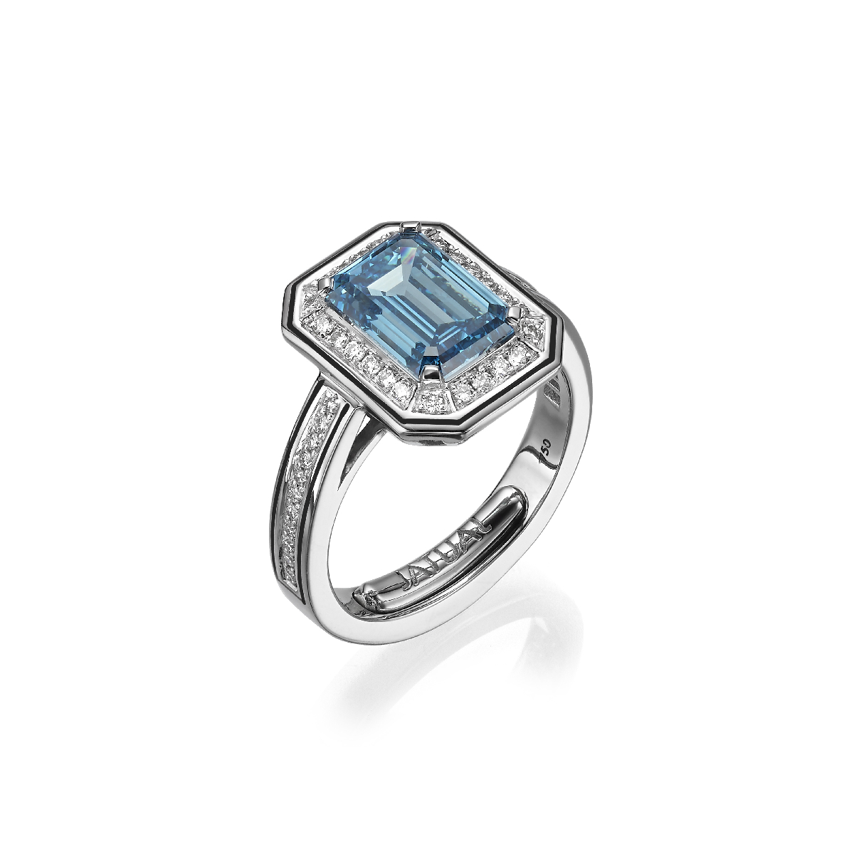 A whisper of 18K white gold embraces the deep, vivid blue of a 3.11 carat eco-diamond, a secret ocean reflecting light. Tiny brilliant stones illuminate its depths, crafting a timeless promise meant only for you. Total carat weight 3.41 CT.