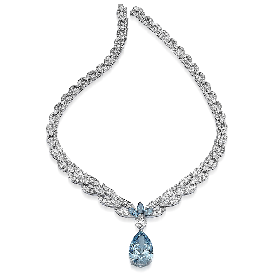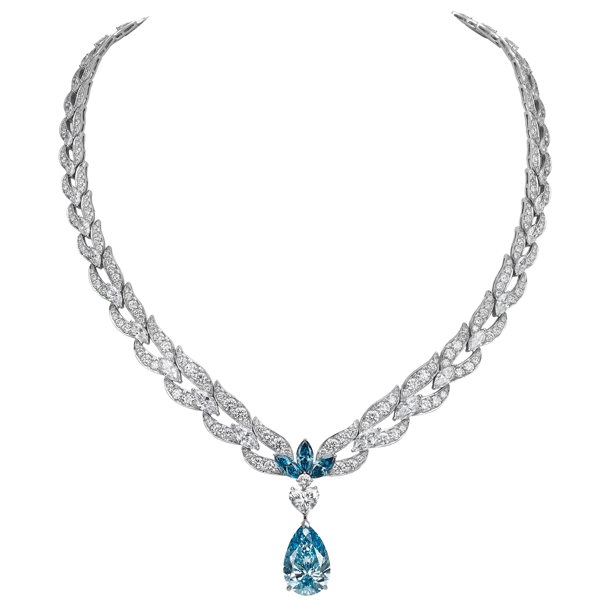 This 18K white gold collier includes an 11.04 carat fancy vivid blue pear-shaped lab-grown diamond and three marquise fancy intense blue lab-grown diamonds. It is accented by 420 lab-grown diamonds with a total weight of 24.66 carats.