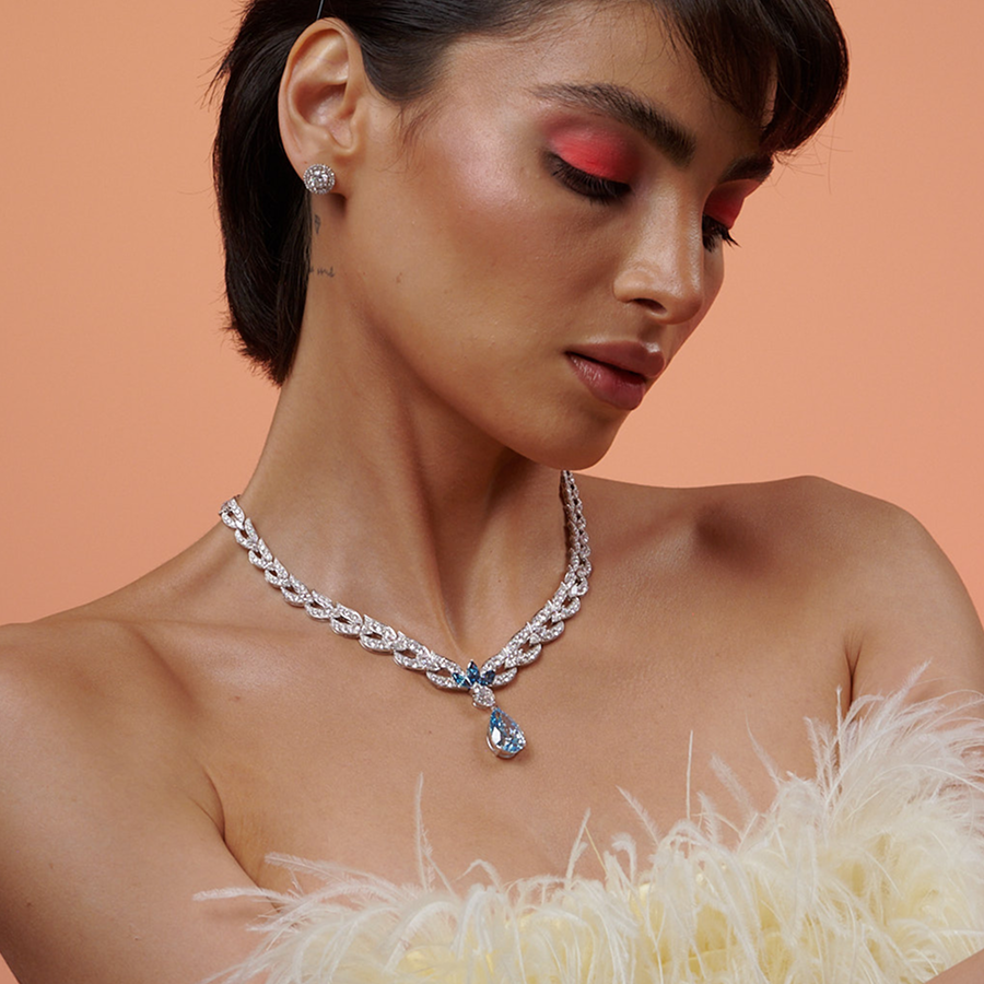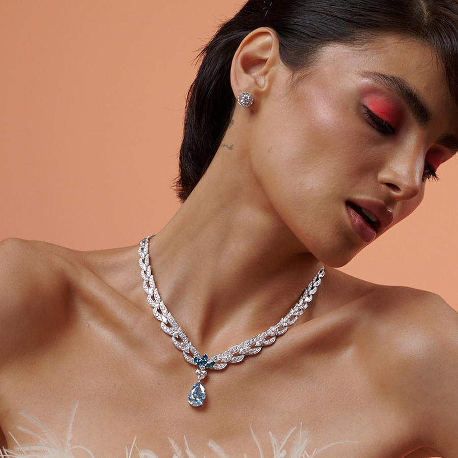 Part of the Ciel de Paris collection, the Mediterranean Princess necklace is crafted in 18K white gold and centers an 11.04 carat fancy vivid blue lab-grown diamond. It is accented by 417 smaller lab-grown diamonds totaling 35.70 carats, creating a balanced and luminous composition.