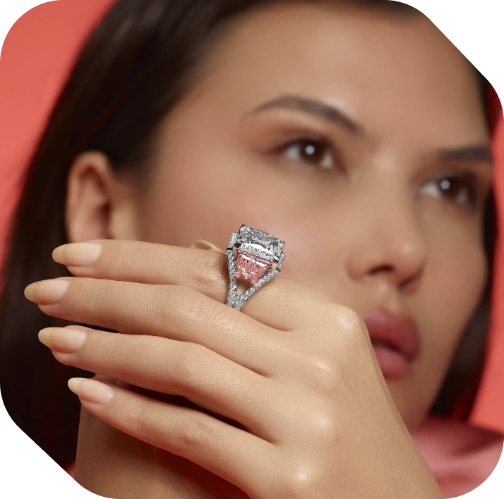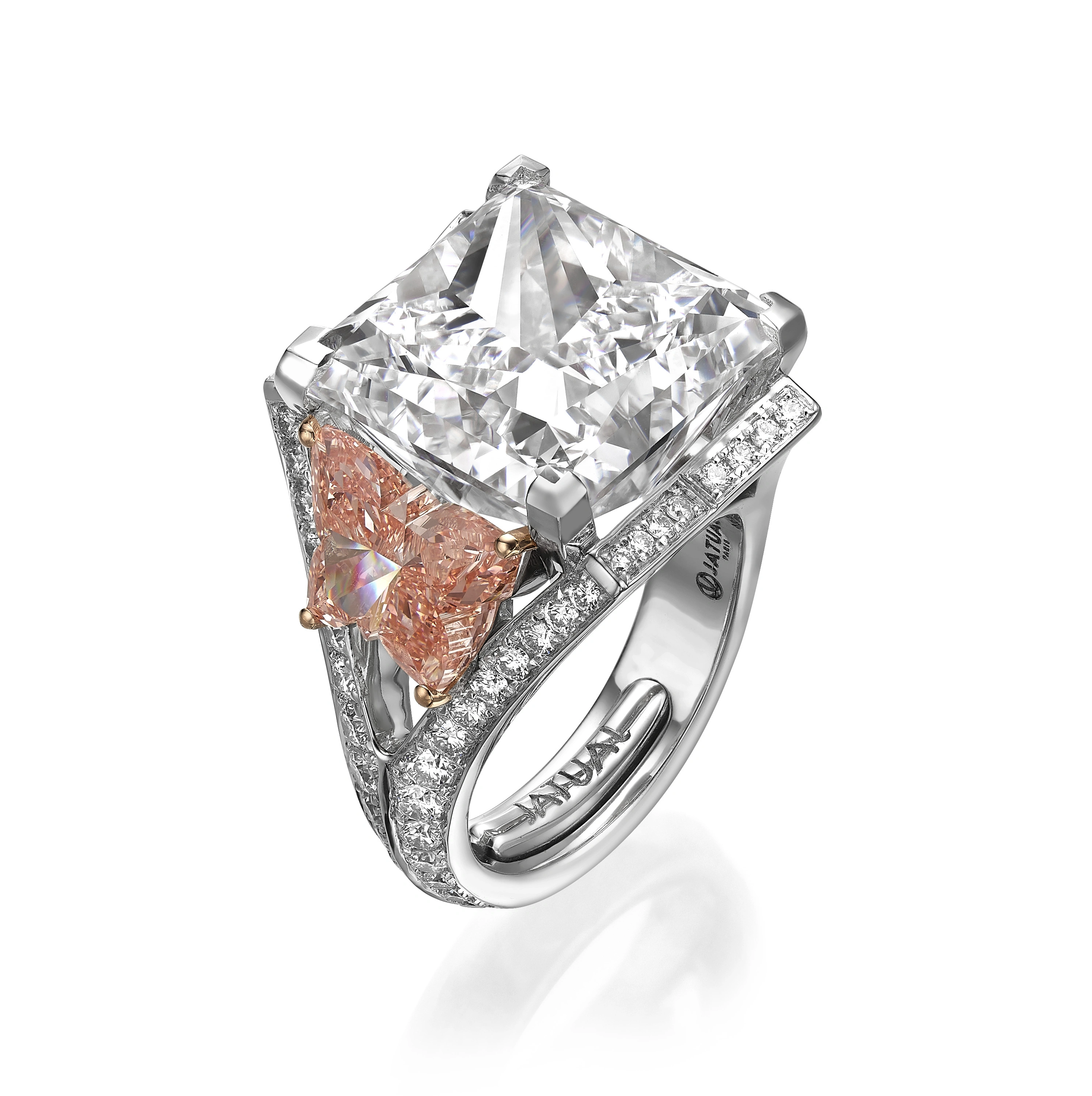 In the Jardins de Paris collection, this 18K white gold ring is defined by a princess-cut lab-grown diamond, accented with pink butterfly-shaped lab-grown diamonds and a halo of D–F VVS stones. The composition emphasizes contrast,