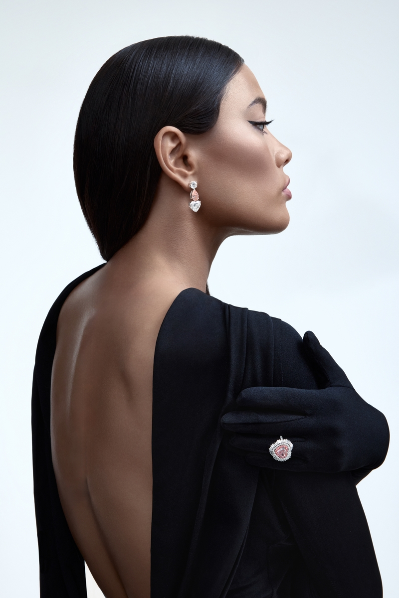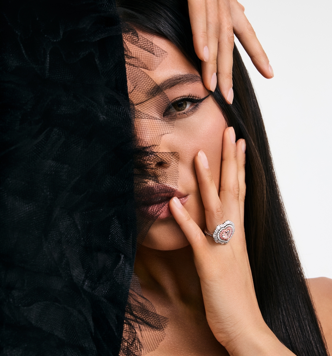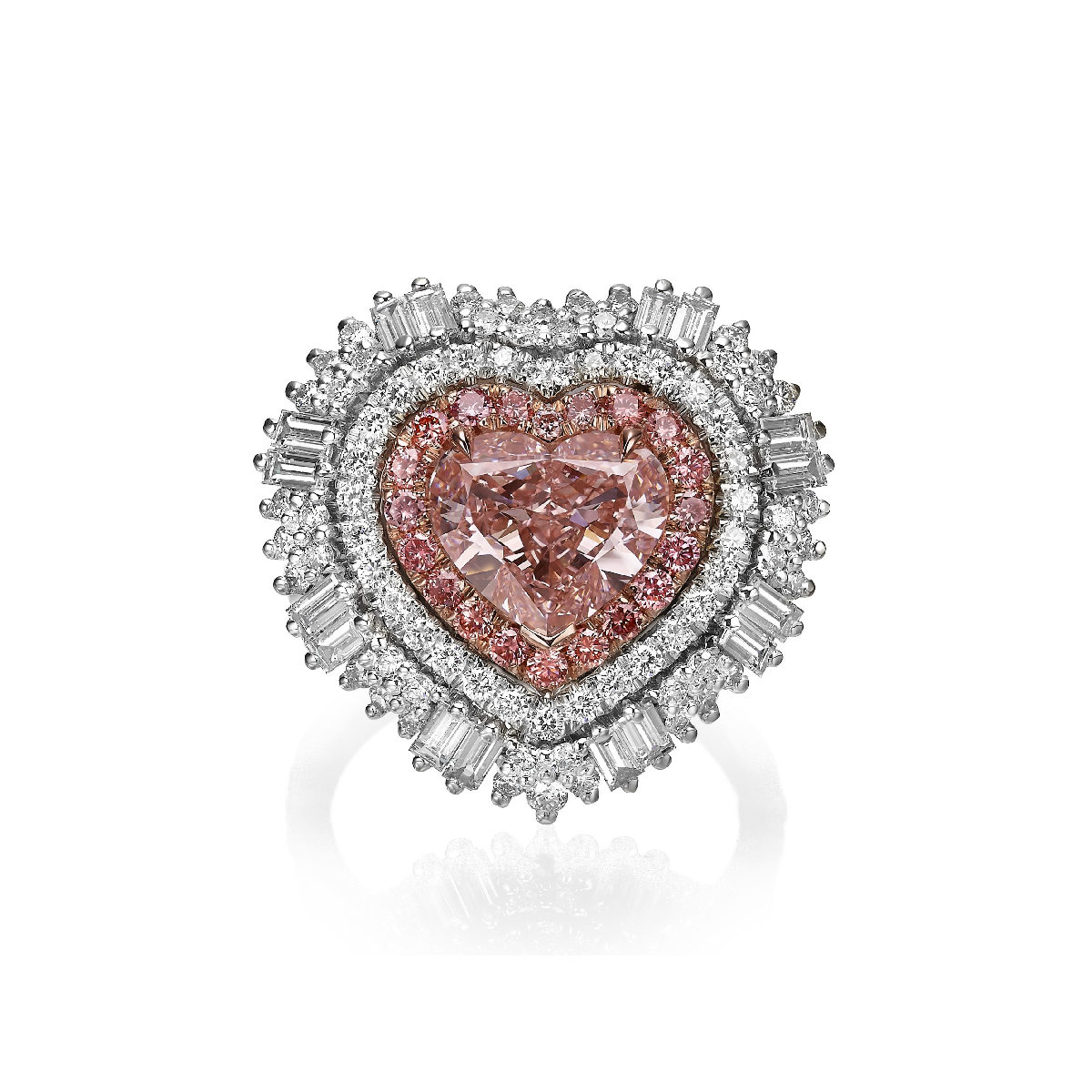 Part of the Le Coeur de Paris collection, the Grand Rose Coeur de Paris design is crafted in 18K rose and white gold and centers a 3.01 carat fancy intense pink diamond. Baguette diamonds frame the composition,