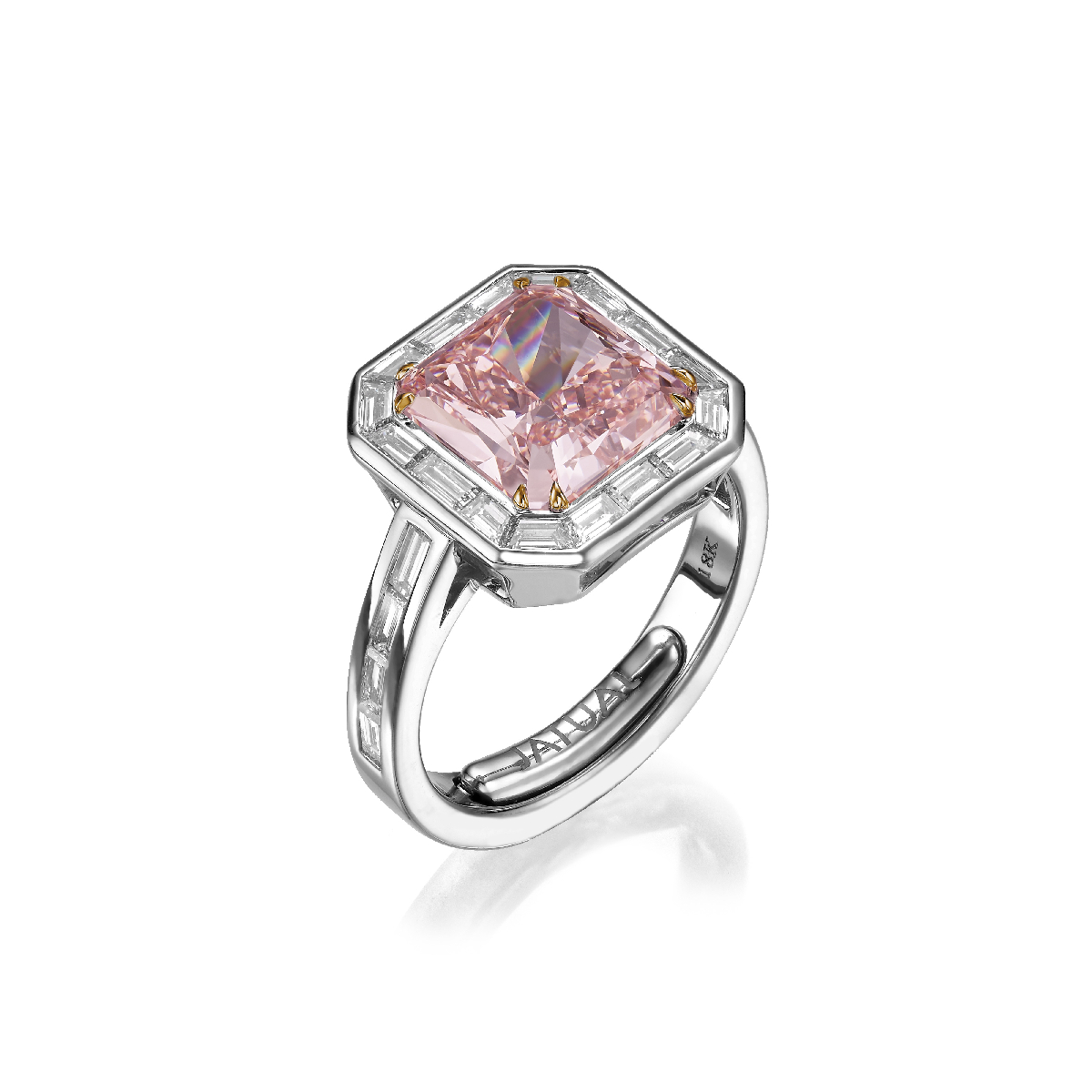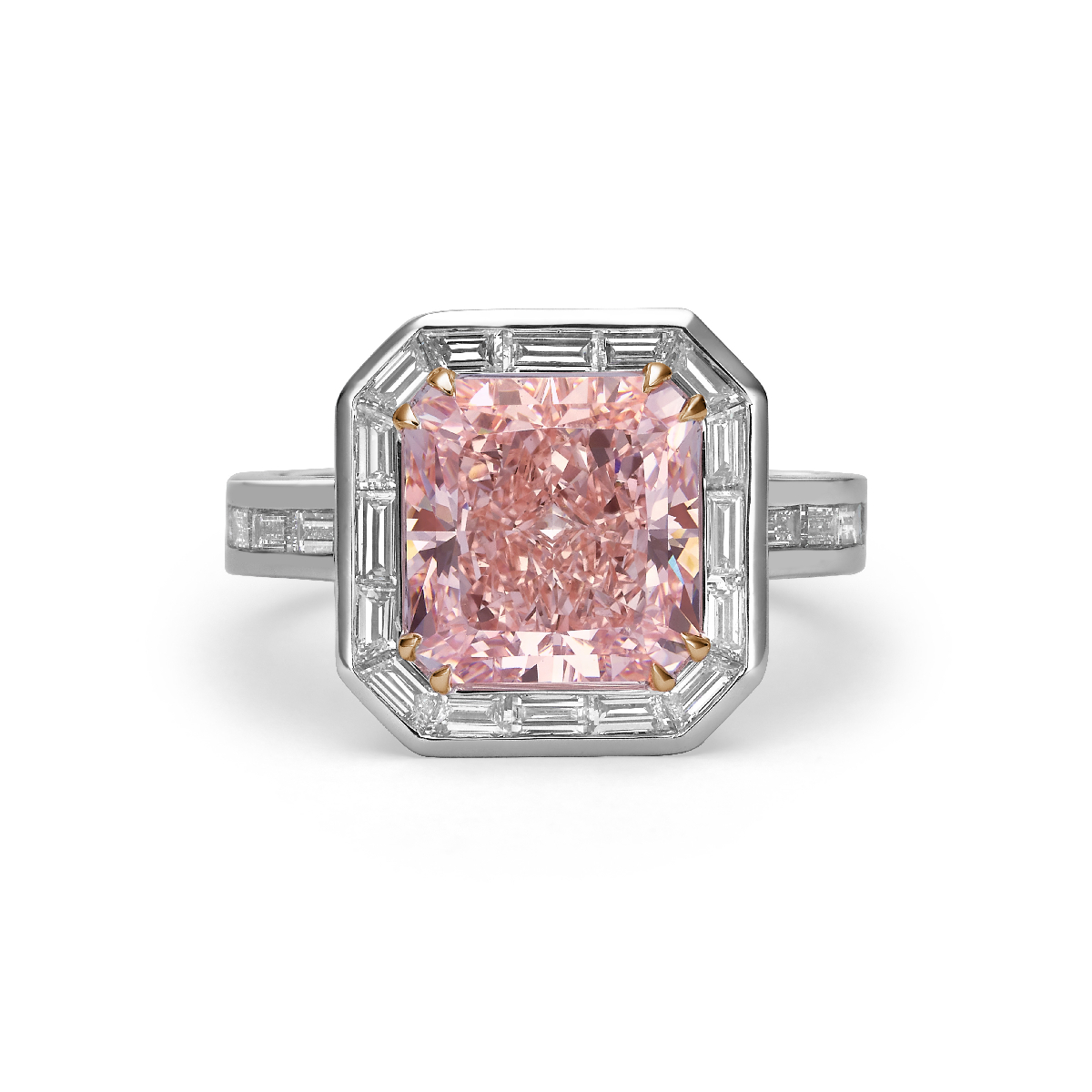 Part of the Reine en Rose collection, this 18K white gold piece features a 3.92 carat fancy intense pink lab-grown diamond at its center. A structured halo of baguette lab-grown diamonds enhances the composition, totaling 4.66 carats.