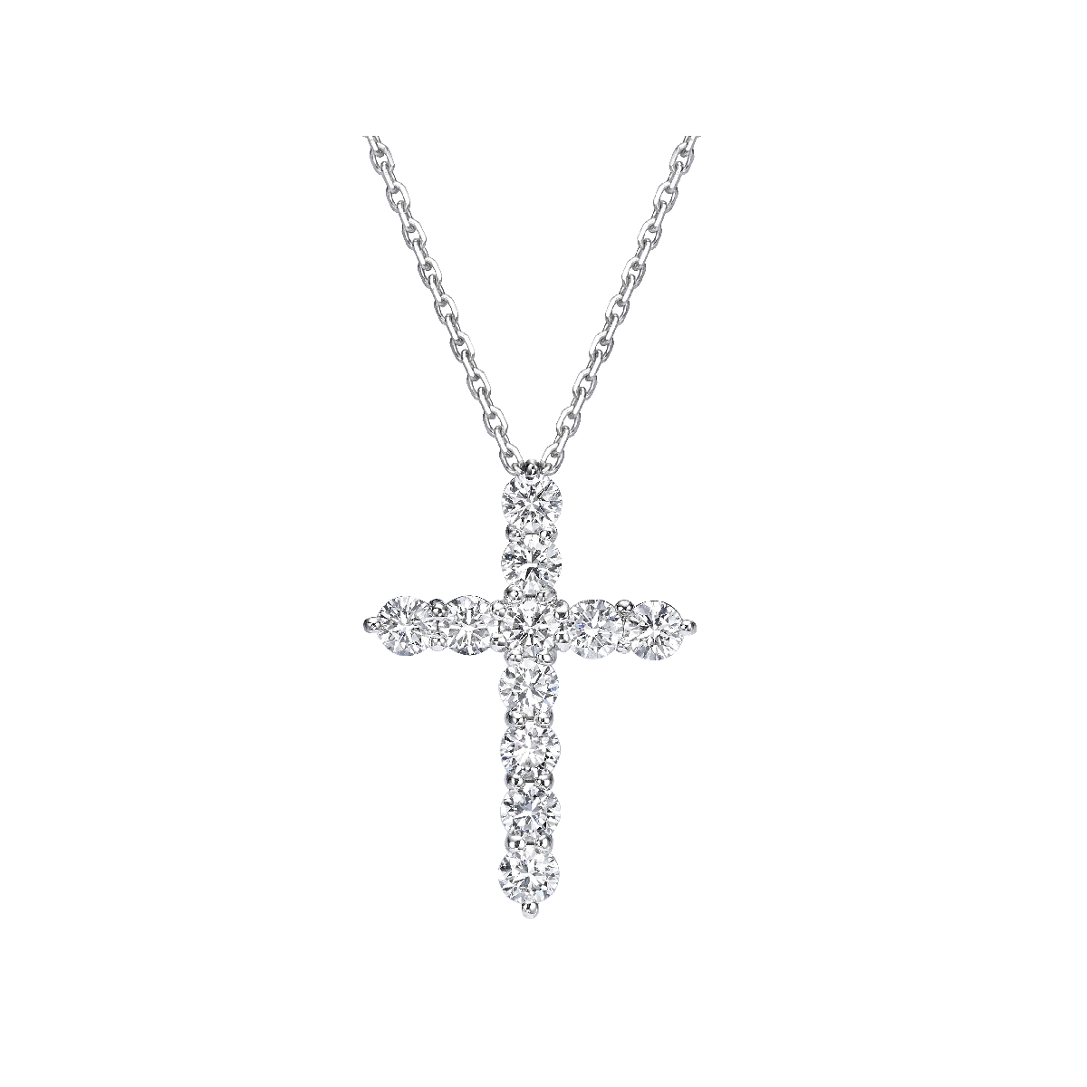 Crafted in 18K white gold and weighing 6.93 grams, this cross pendant is set with 11 round brilliant lab-grown diamonds totaling 2.90 carats, complemented by 86 additional lab-grown diamonds totaling 0.20 carats. The overall diamond weight reaches 3.10 carats, graded D–E color and VVS1–VVS2 clarity, creating a balanced and luminous composition.