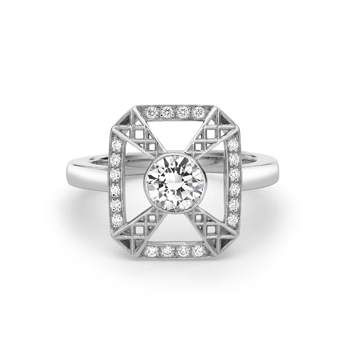 Set in 18K white gold, this ring features a 0.7 carat round lab-grown diamond, D color, with 21 round accent diamonds. Total weight: 0.96 carats. The lattice setting adds a distinctive detail.
