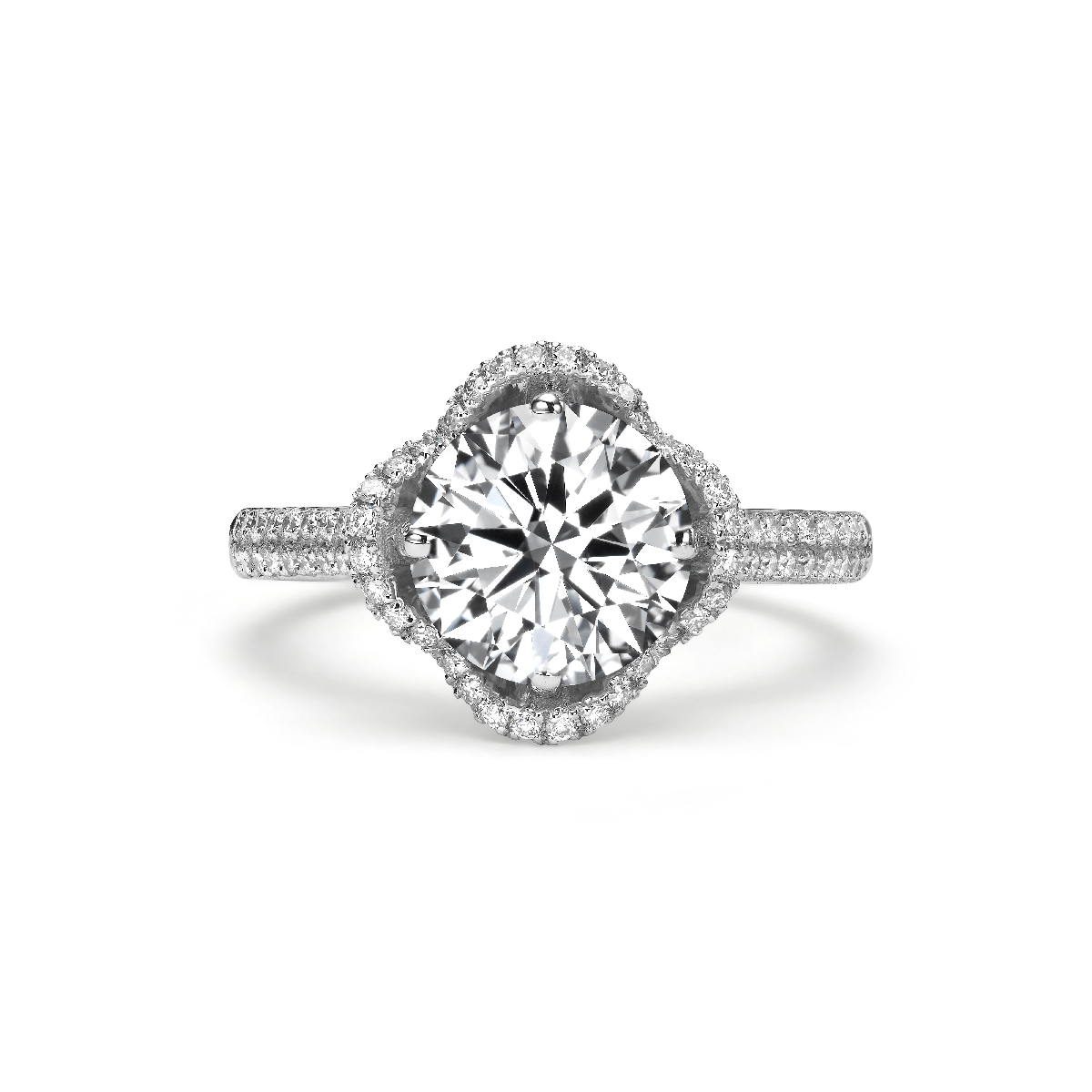 Set in 18K white gold, this ring features a 2.00 carat round brilliant lab-grown diamond with surrounding diamonds forming a flower-inspired design. The total weight is 4.47 carats.
