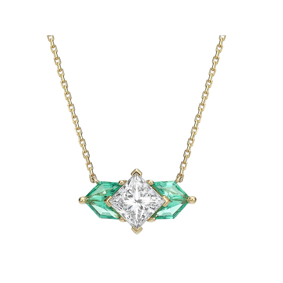This 18K yellow gold pendant is set with a princess-cut lab-grown diamond, accented by step-cut green emeralds. Its horizontal suspension emphasizes the precise alignment and harmony of the gemstones.