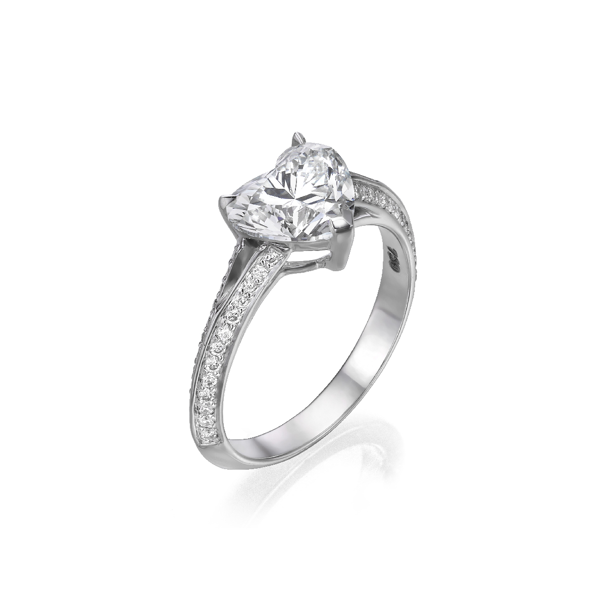 Crafted in 18K white gold, this ring features a 2.03 carat heart-shaped lab-grown diamond, graded F color and VVS2 clarity. It is surrounded by D–E color VVS diamonds, creating a balanced and luminous composition.
