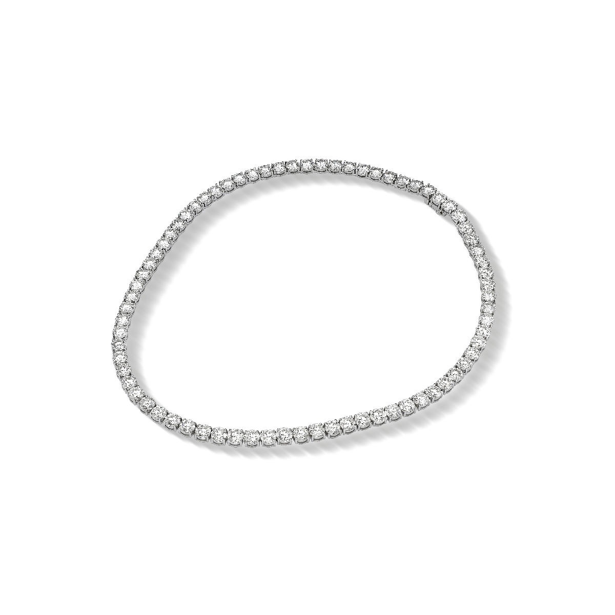 Crafted in 18K white gold, this tennis necklace features 74 round brilliant lab-grown diamonds totaling 53.97 carats, graded D–F color and VVS clarity. The continuous rivière design is clean, balanced, and
