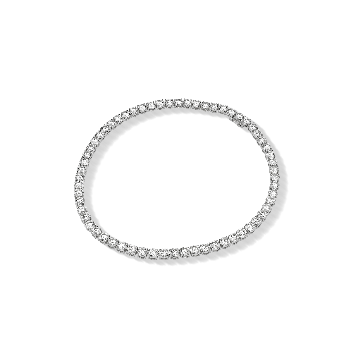 Crafted in 18K white gold, this tennis necklace features 62 round brilliant lab-grown diamonds totaling 64.33 carats, graded D–F color. The rivière design is continuous and precisely set, emphasizing clarity and