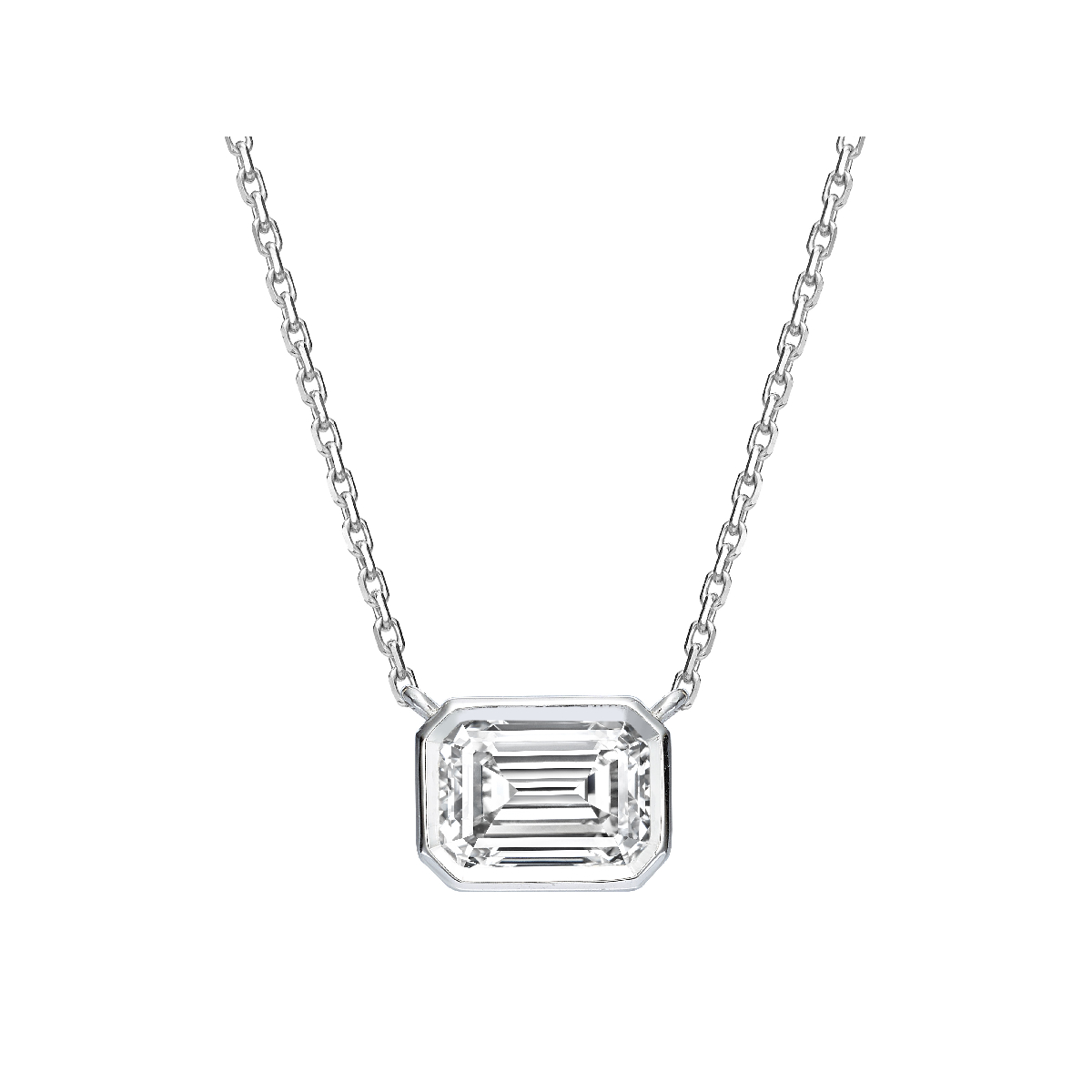 This 18K white gold pendant is set with a step-cut lab-grown emerald-shaped diamond. The pendant’s graceful suspension emphasizes the stone’s clarity, geometry, and luminous sparkle.